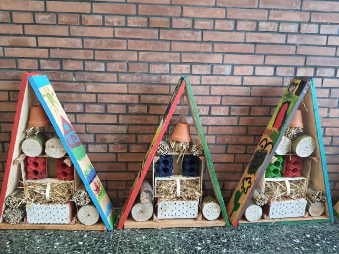 Die kleinen Füchse, Frösche und Schildkröten hatten eine wunderschöne Projektwoche. Die Ergebnisse können sich wirklich sehen lassen. Neben einer Theorieeinheit zum Thema Insekten wurden große Insektenhotels gebaut. Außerdem noch kleine aus Konservendosen. Für die Fenster wurde eine bunte Frühlingswiese gebastelt. Windspiele für unseren Durchgang wurden aus Stoffresten geknotet. Und die ganz schnellen Kinder haben noch Stöcke mit Wolle umwickelt. Vielen Dank an alle helfenden Hände.