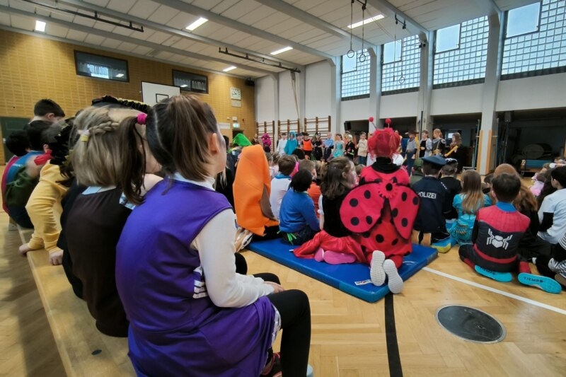Am Freitag hat sich die gesamte Schulgemeinde wieder in einen buten Haufen verwandelt und gemeinsam Karneval gefeiert. Viele Prinzessinnen, Ninjas, Piraten, Clowns und Hexen versammelten sich erst in den Klassenräumen, um sich dort mit Spielen und Süßigkeiten einzustimmen. Nach der großen Pause trafen sich dann alle in der Turnhalle und haben sich insgesamt 16 Darbietungen anschauen dürfen. Dabei haben ganze Klassenstufen ihr Können gezeigt aber auch kleine Gruppen haben getanzt oder Sketche vorgestellt. Ein Höhepunkt war sicherlich der Sockentanz, bei dem die selbstgestalteten Socken der 4a alle zum Lachen aber auch Stauenen gebracht haben.